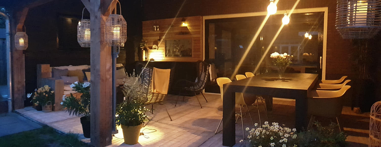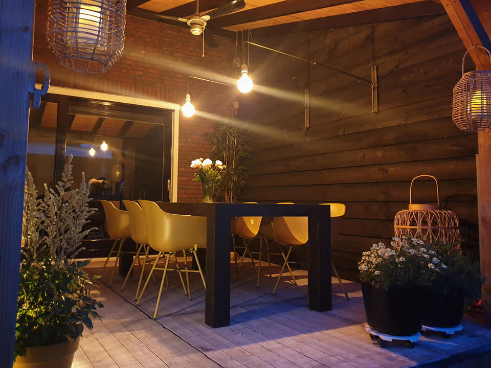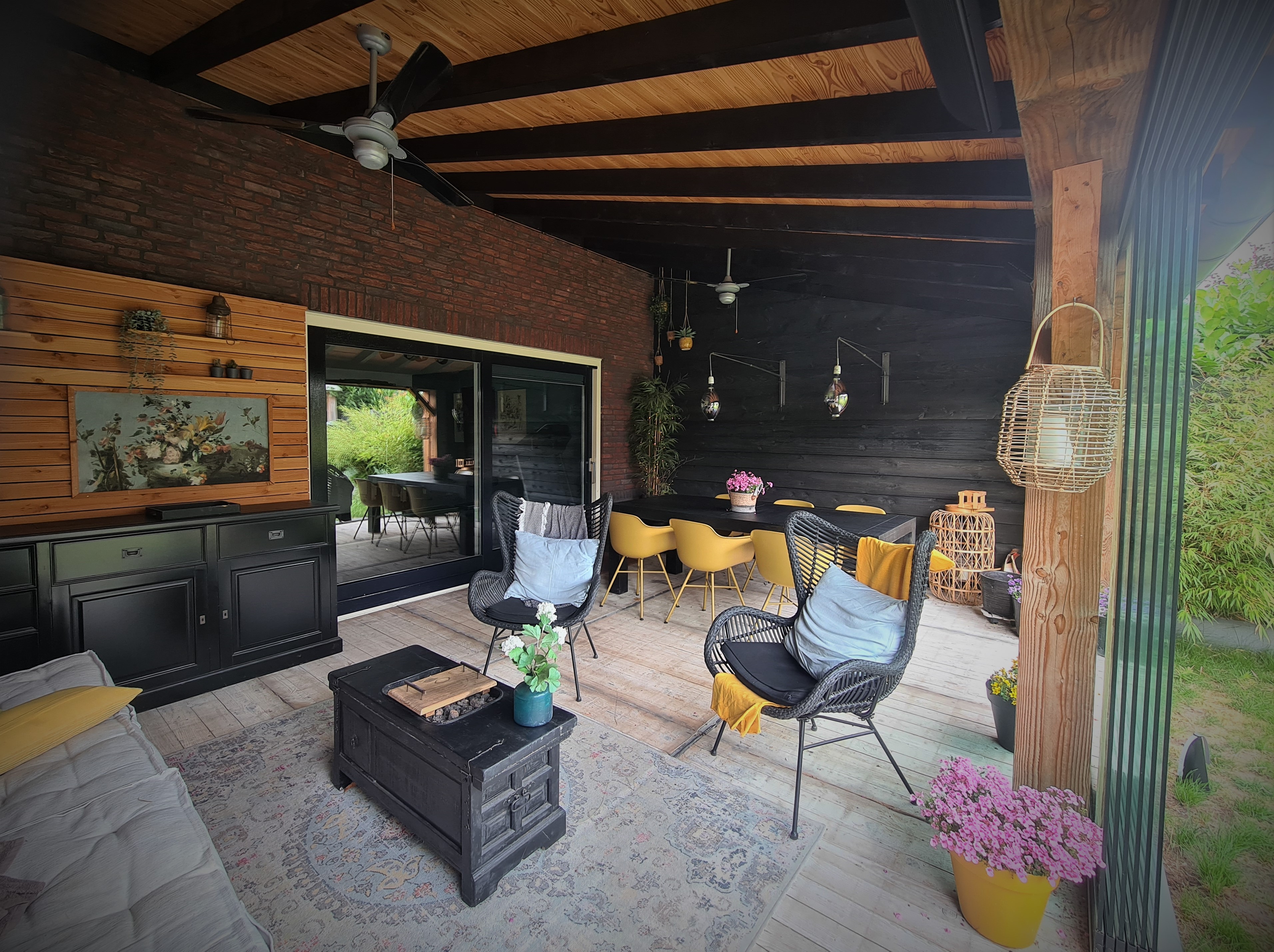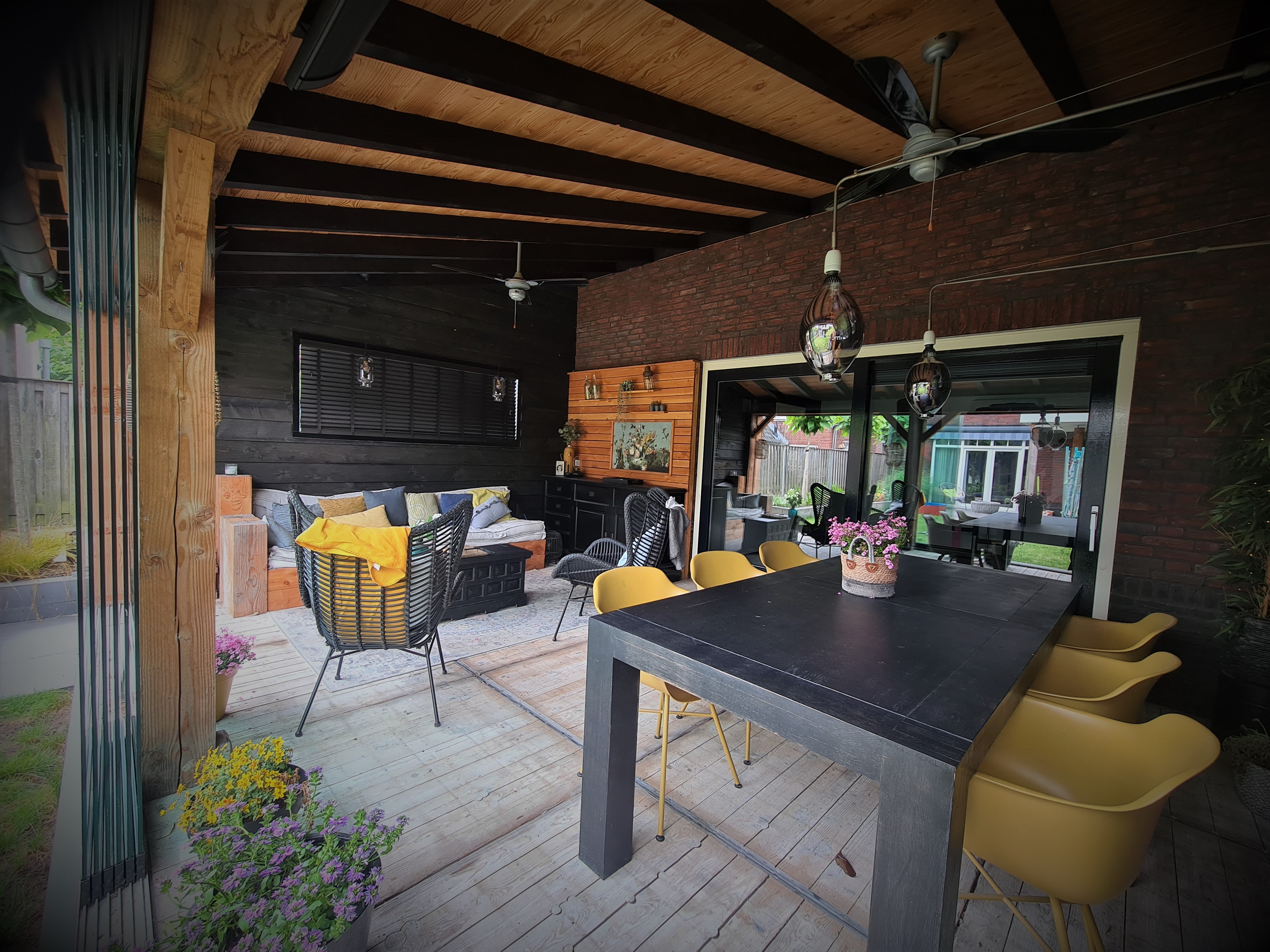 De combinatie van steen, Douglashout en potdekseldelen maakt deze veranda tot een plaatje. Kijk eens naar die enorme staanders, dat is nodig om het pannendak goed op te vangen. Dit geeft de veranda een autenthieke uitstraling. Wordt het wat kouder? Geen probleem. De glazen schuifpui met zes glazen delen kunnen de veranda helemaal afsluiten. Alles door Kleinbouw Twente ontworpen en gemaakt. Laat de zomer maar komen!