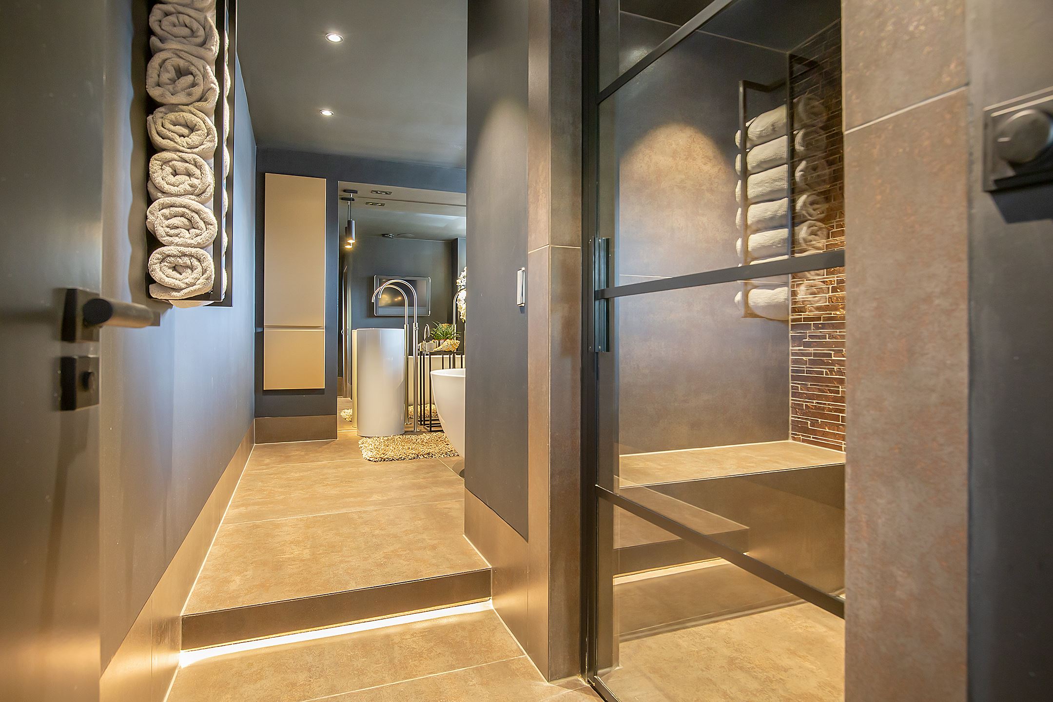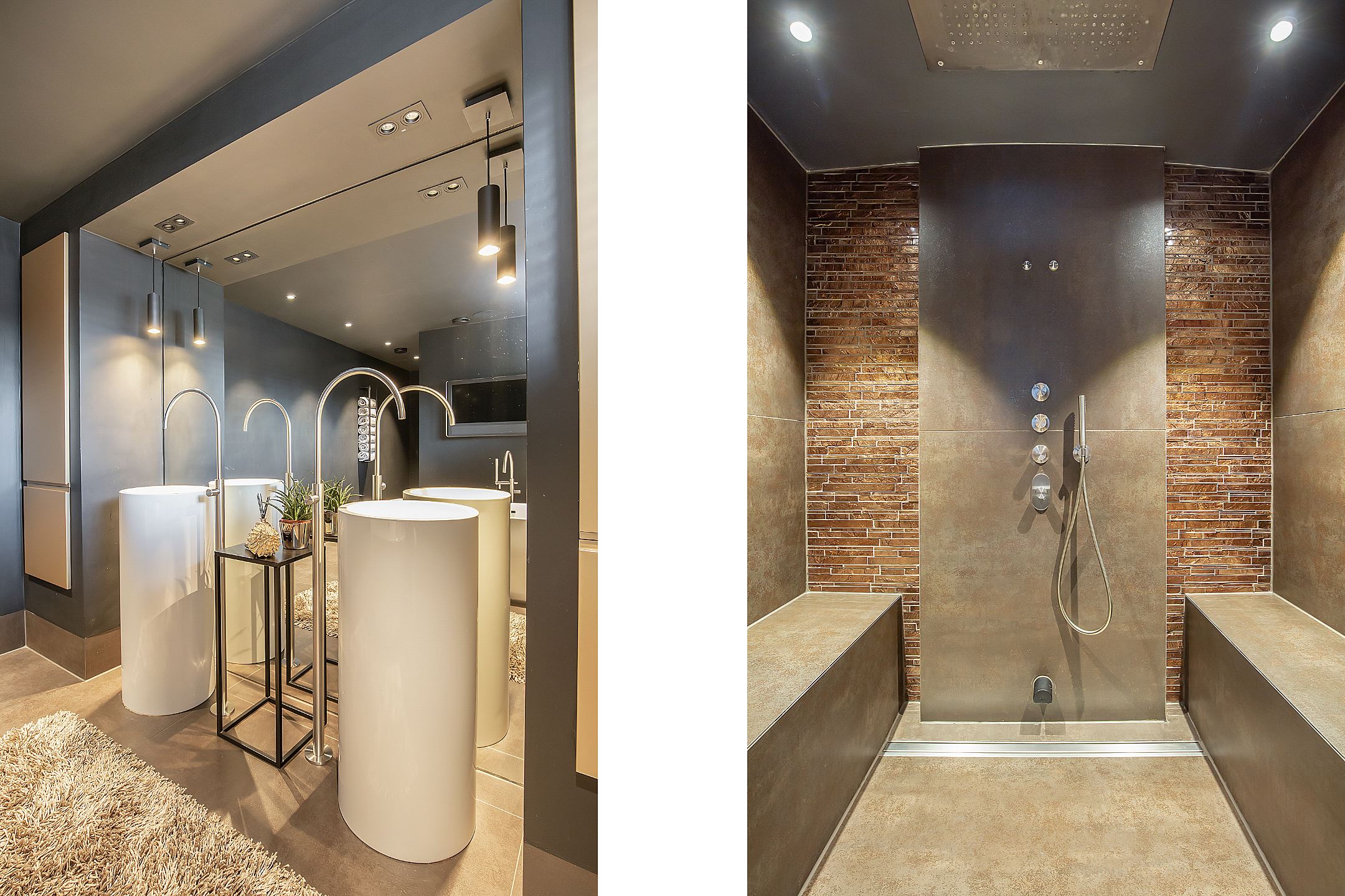 Dit is wel de badkamer onder de badkamers. Alles aan deze badkamer is stijlvol en uniek. Zo bestaat de muur uit één grote spiegel met daarvoor prachtige pilaren met kranen. De douche is gemaakt voor twee personen en heeft ook een stoomfuntie. In deze ruimte zijn bankjes geplaatst waar je relaxed kunt zitten. Kleinbouw Twente heeft deze badkamer van A tot Z gerealiseerd. Wij hebben vakmensen voor het installatiewerk en ervaren tegelzetters in dienst. Wilt u ook uw badkamer renoveren? Neem contact op met Kleinbouw Twente!
