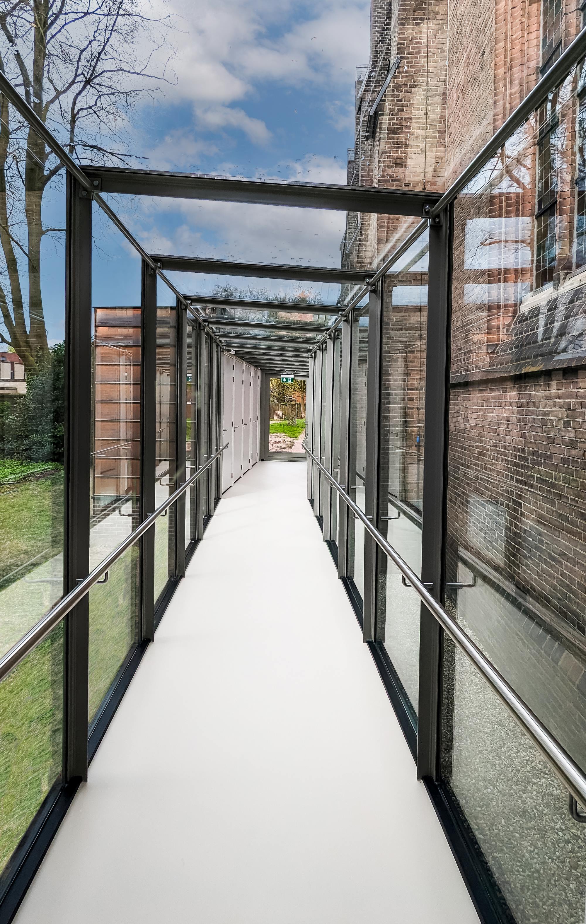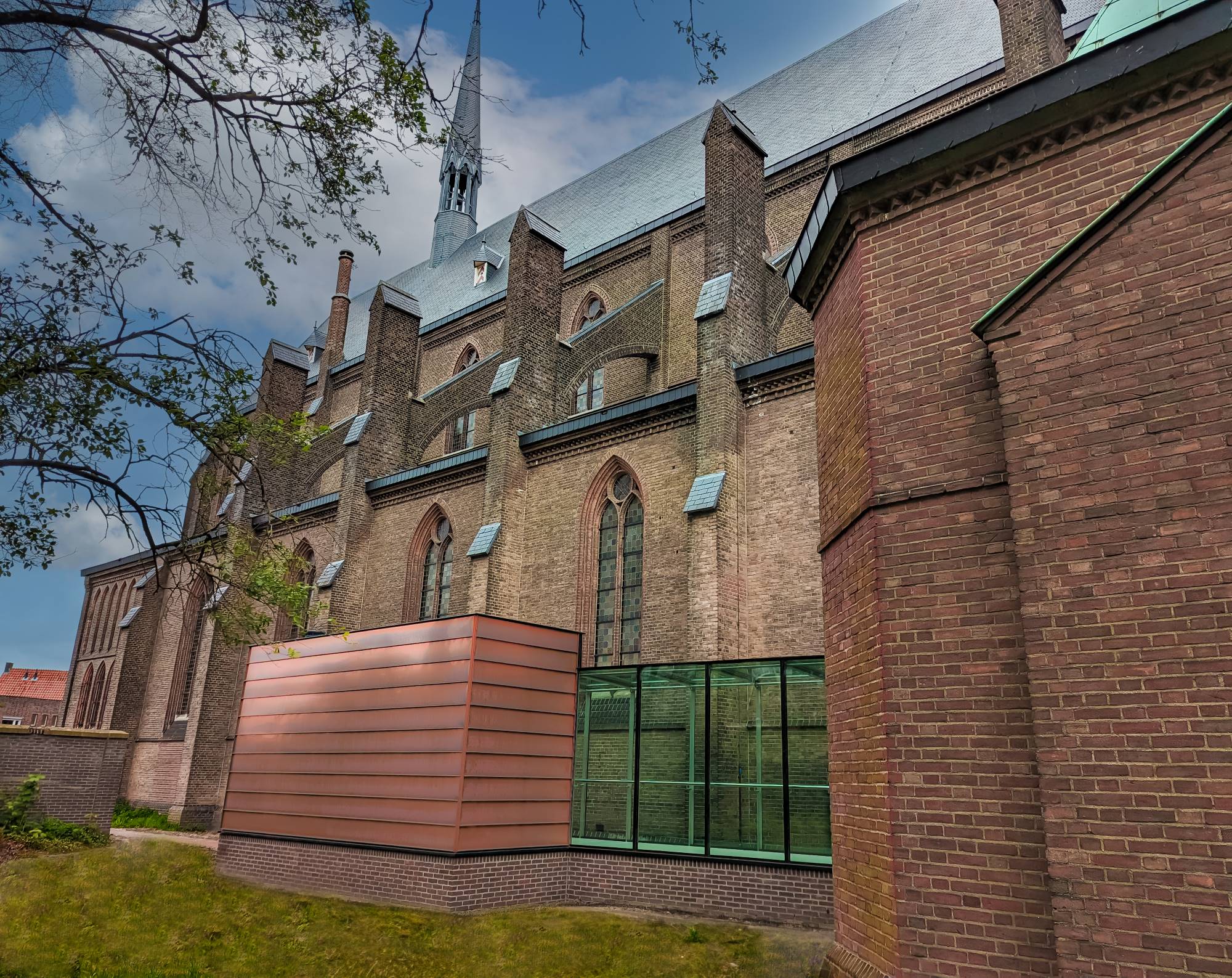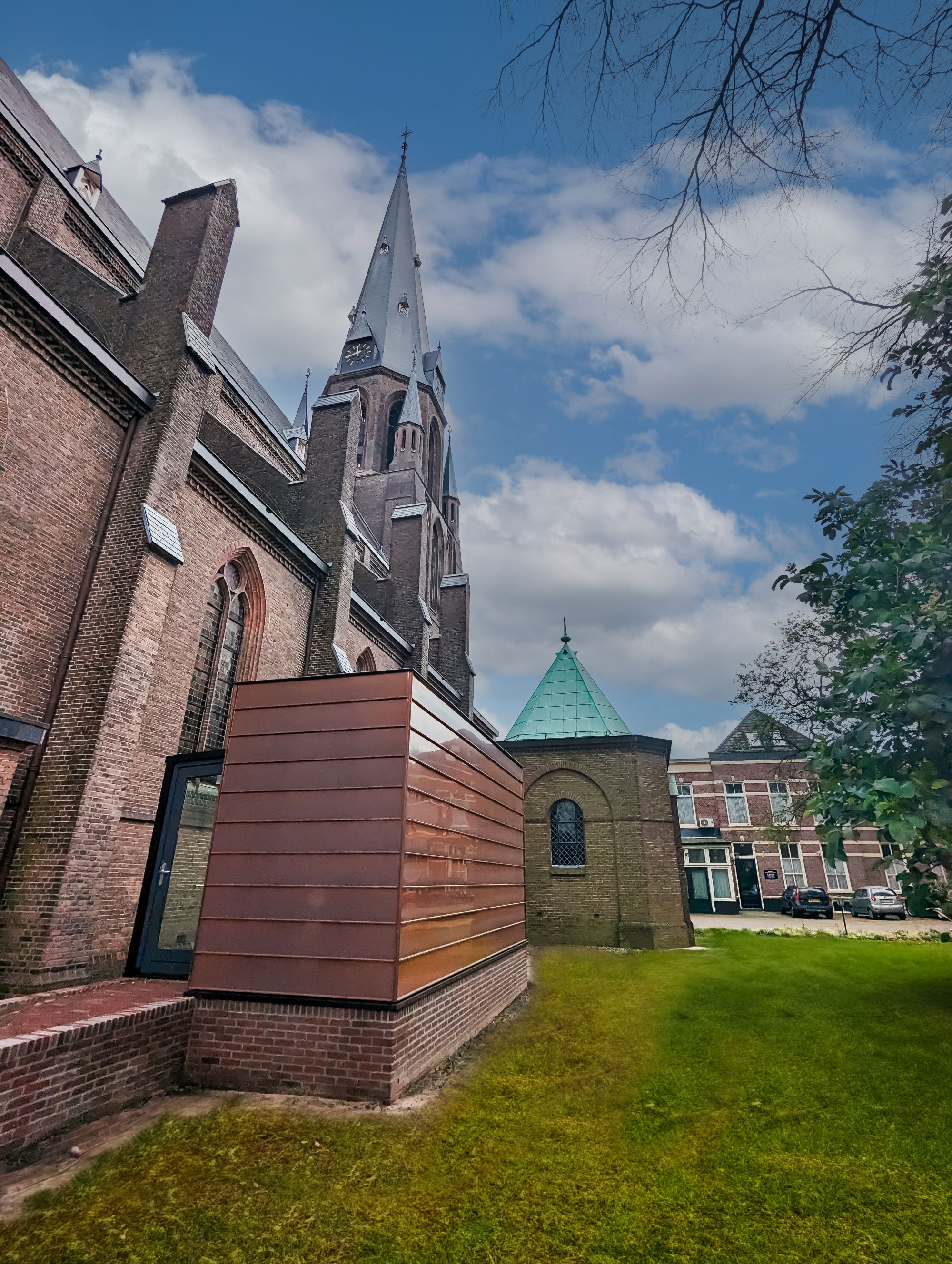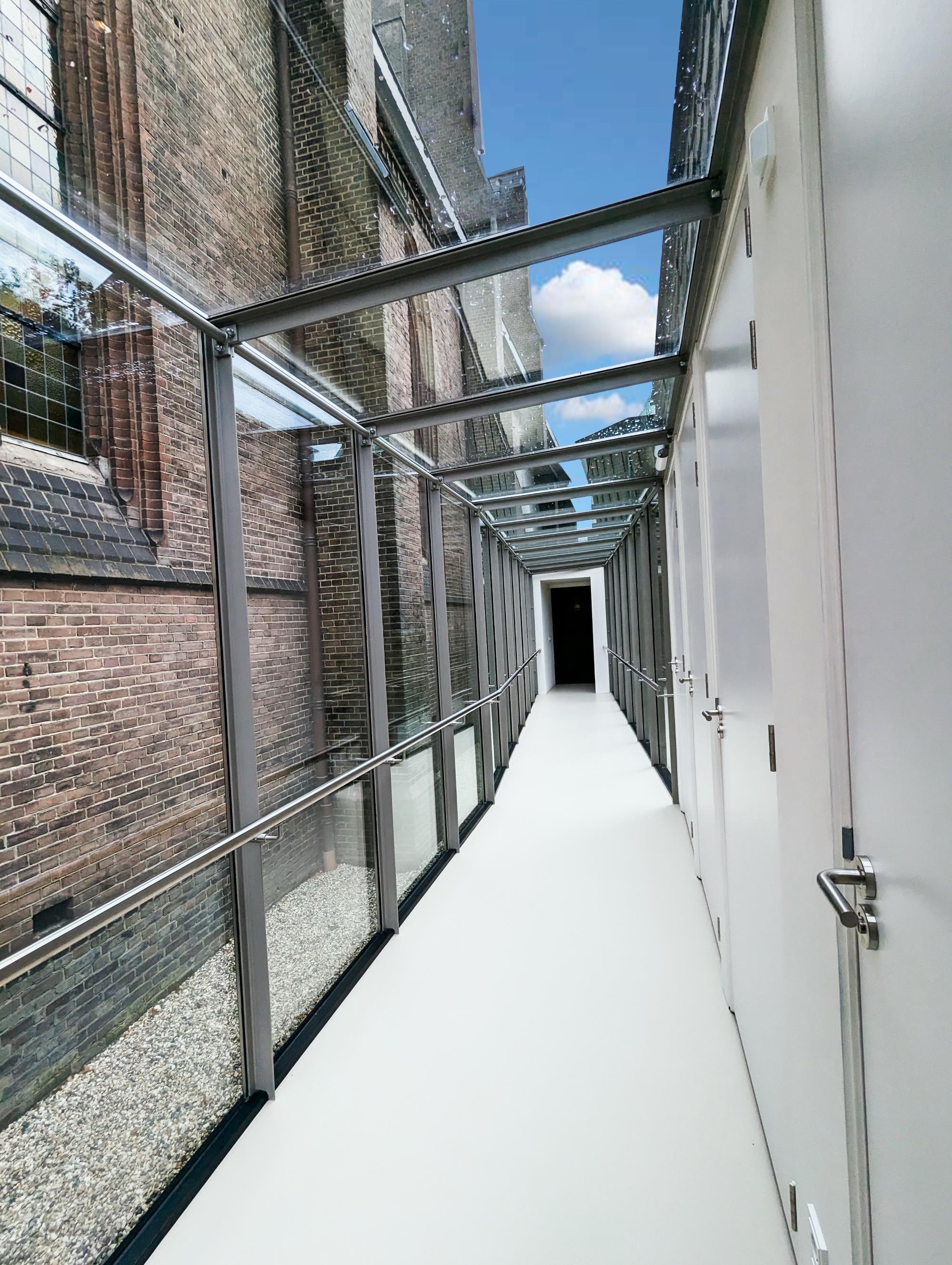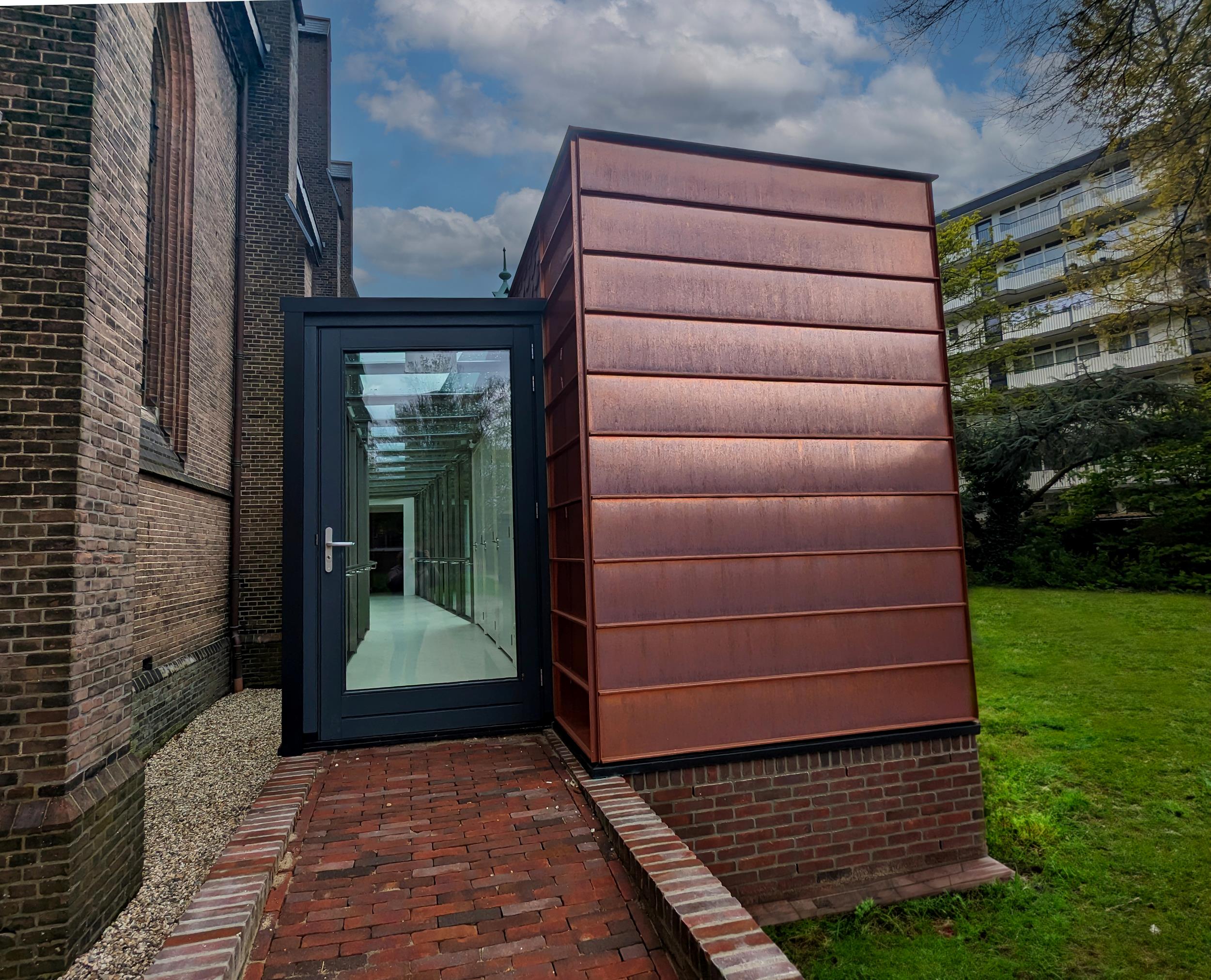De Jozefkerk in Enschede is al een plaatje, maar is nu nóg een beetje mooier. In samenwerking met van der Jeugd architecten heeft Kleinbouw Twente een loopbrug van glas en een fraaie toileten-unit gerealiseerd. De unit is aan de buitenkant afgewerkt met zink waardoor het passend is bij de zinken daken. De toiletunit bevat drie gewone en één invalidetoilet. De railing van de loopbrug heeft geïntegreerde ledverlichting zodat de brug s ‘avonds fraai wordt verlicht.