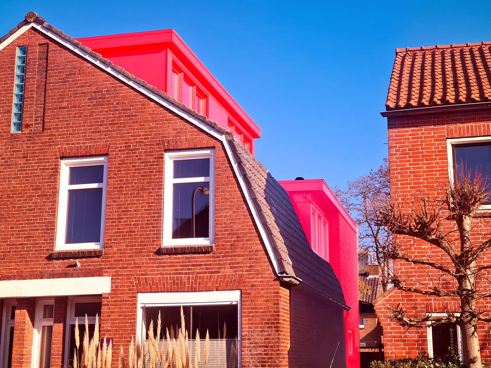 Dakkapel en uitbouw begane grond en eerste verdieping. Roze gedeelten zijn bijgebouwd.