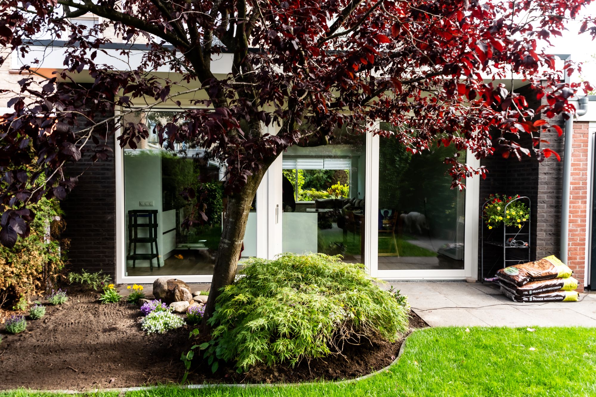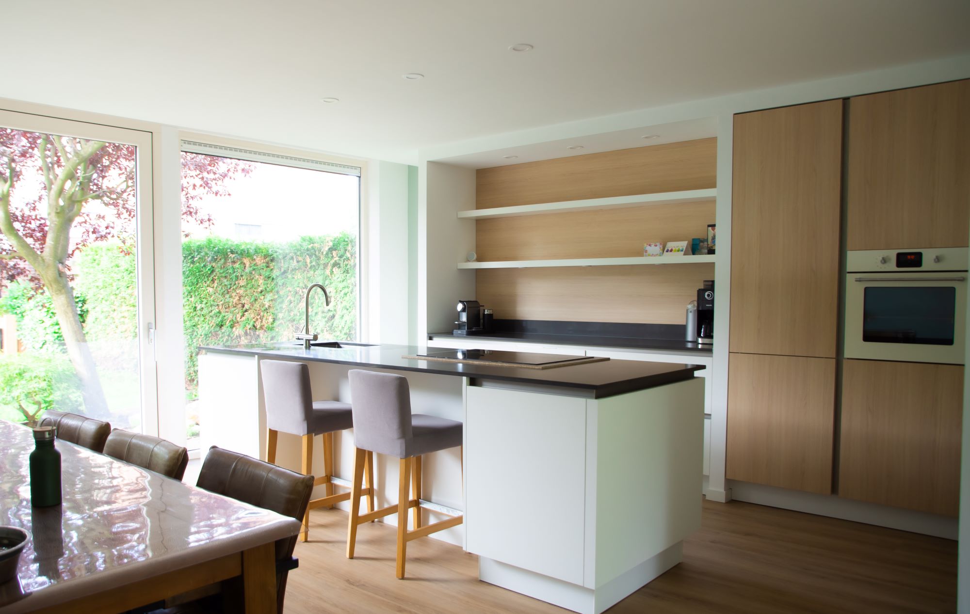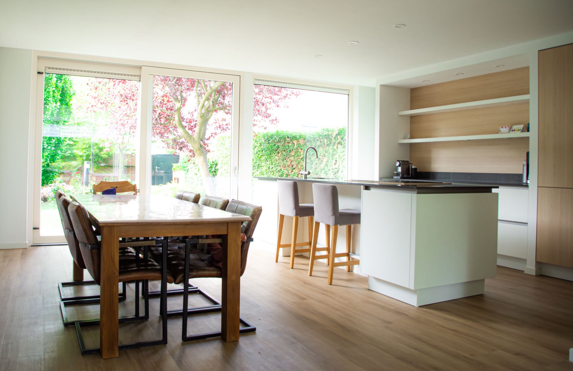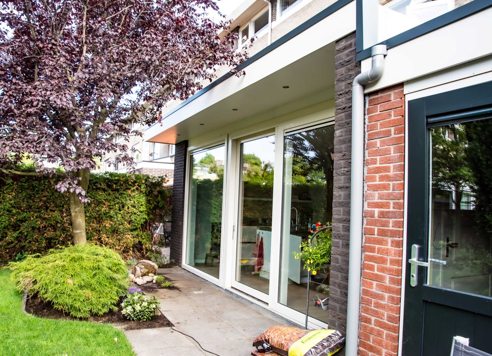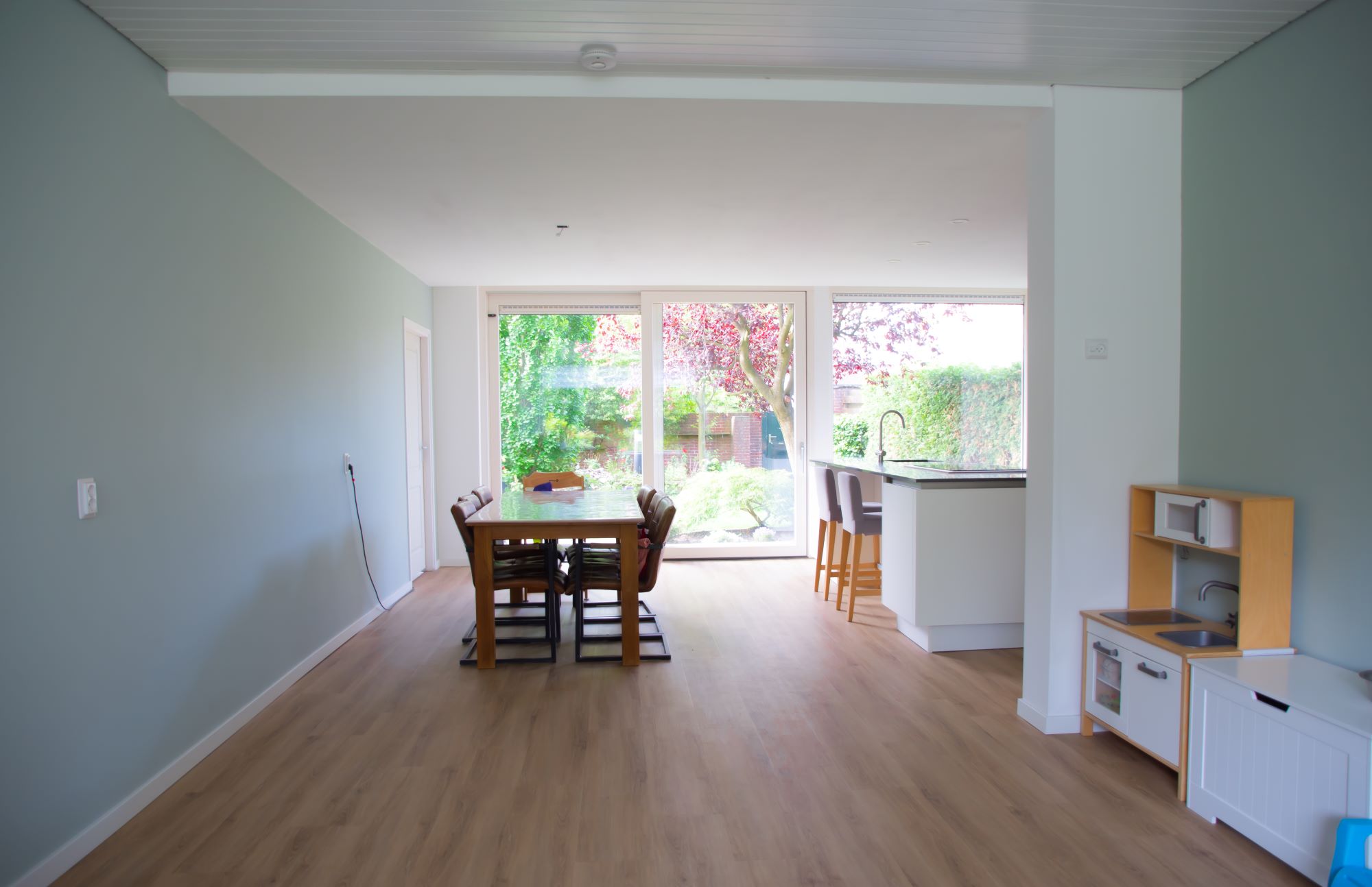 Wat een ruimte en licht! Deze uitbouw van 6x4 meter geeft veel extra ruimte maar vooral woongenot. In dit geval wordt deze uitbouw gebruikt als grote woonkeuken. Dankzij de grote schuifpui is er direct toegang tot de tuin. De uitbouw past perfect bij de bestaande bouw en is afgewerkt met de beste materialen. Er is een extra grote overstek gemaakt met spotjes. Dit geeft vooral s'avonds een prachtige luxe uitstraling.